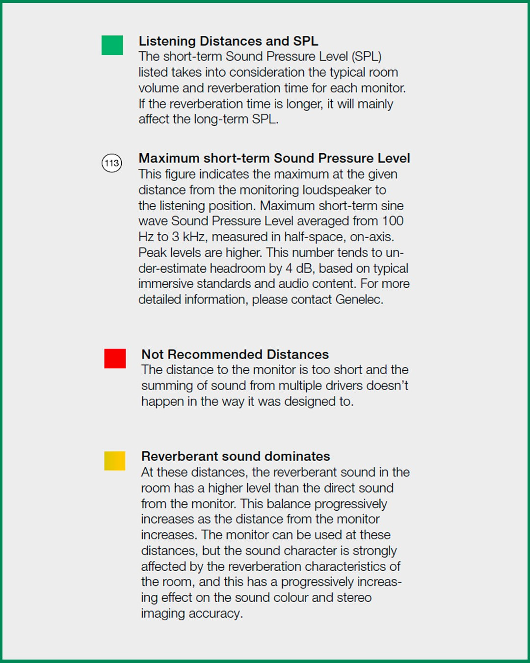 2m 에서는 109dBSPL, 4m 에서 103dBSPL로 음압 설계되어 있다고 볼 수 있다. 따라서, 이러한 스피커는 대략 4m거리까지도 85dBSPL을 표현할 수 있다. 따라서, 니어필드 모니터 스피커보다 더 먼 거리에서 사용한다. 다소 떨어진 거리에서 다수의 사람들이 청취할 수 있도록 청취 스팟이 형성된다.