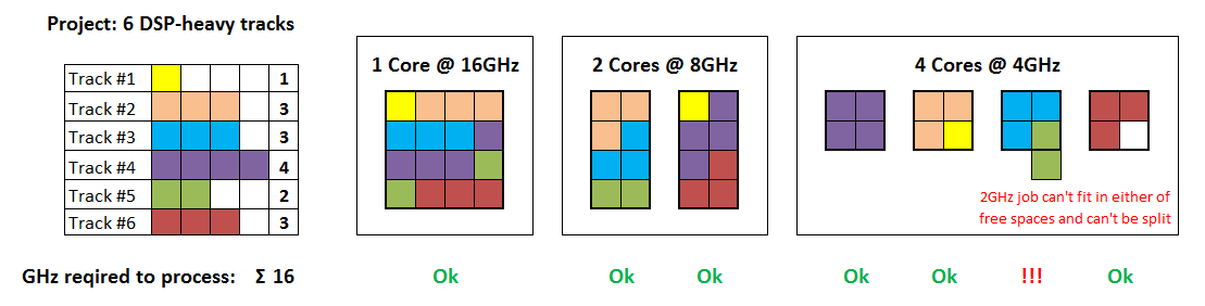 트랙 안의 플러그인들은 대부분 직렬이라 한 트랙의 DSP는 “한 코어가 통째로 맡아야 하는 덩어리”가 된다. 그래서 2GHz가 필요한 트랙은 1GHz 코어 두 개로 나눌 수 없고, 최소 2GHz를 한 번에 내줄 수 있는 코어 하나가 꼭 필요하다. 그림에서 총 필요 연산량은 똑같이 16GHz지만, 코어를 4개(각 4GHz)로 쪼개면 어떤 트랙 덩어리가 남는 공간 1GHz+1GHz로 분할되지 않아 특정 코어만 포화되는 상황이 생긴다.
