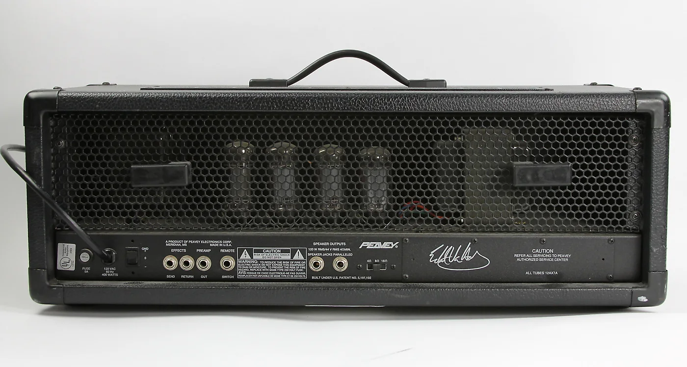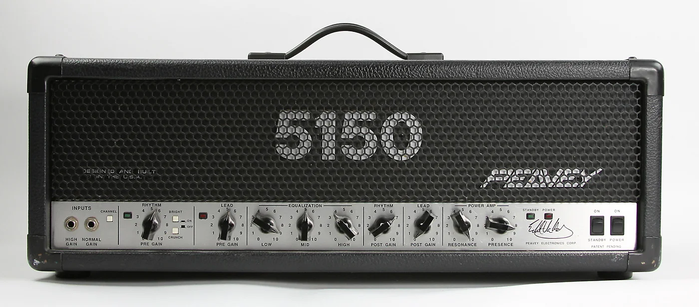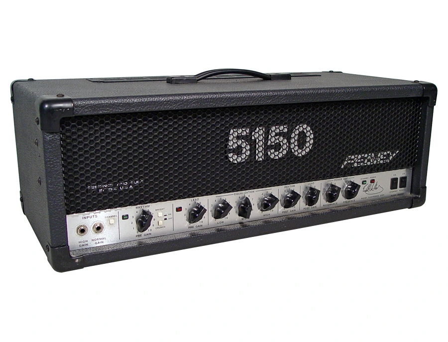 Peavey 5150는 Eddie Van Halen의 시그니처 모델로 개발된 120와트 올-튜브 기타 앰프 헤드로, 하이게인 록과 메탈 사운드를 정의한 전설적인 앰프입니다. 특히 출력단이 콜드 바이어스(cold-biased)로 설계되어 더 제어 가능한 게인과 넓은 다이내믹 레인지를 제공하며, 강력한 출력과 타이트한 저음, 선명한 고음으로 스테이지와 스튜디오에서 널리 사용됩니다.