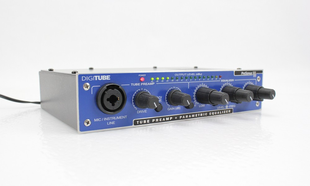 PreSonus DigiTube는 12AX7 싱글 튜브 + 3밴드 스윕 EQ + 24비트 S/PDIF를 장착한 하프랙 1U 프리입니다. AC 어댑터 구동으로 사운드카드 업그레이드를 위한 올인원 아날로그-디지털 솔루션입니다.