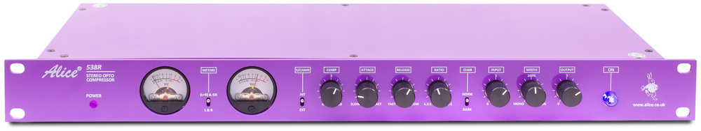 Alice 538R은 Ted Fletcher의 JoeMeek SC2 계보를 잇는 스테레오 광학(M-S) 컴프레서입니다. OEP 트랜스포머와 Alice 옵토셀 2개로 드럼버스 펌핑부터 보컬 글루까지 커버하는 1U 클래식입니다.