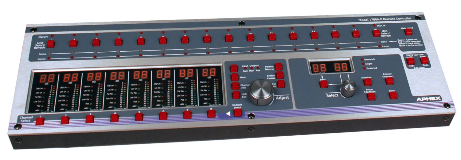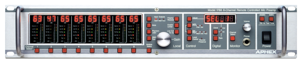Aphex 1788은 8채널 리모트 컨트롤 마이크 프리로, 장거리 케이블 손실을 방지합니다. MIDI/RS232/RS422로 제어하며, 2U에 8개 Aphex 프리 + 다중 아날로그/디지털 출력을 제공하는 스테이지/오케스트라 솔루션입니다.