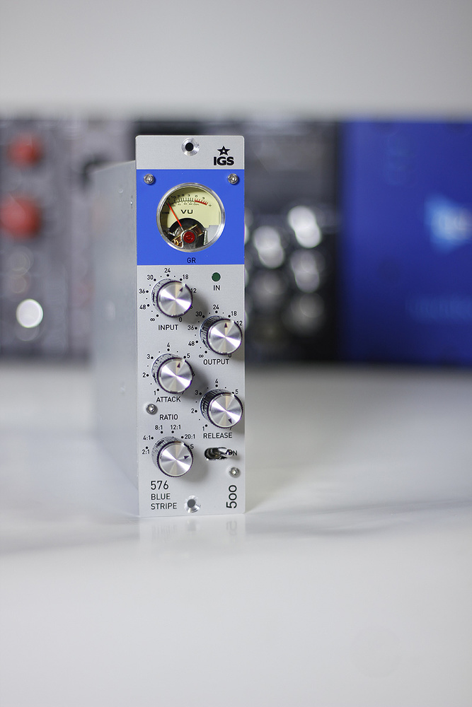 IGS Audio 576 Blue Stripe는 UREI 1176 Revision A 'Blue Stripe'를 500 시리즈로 재현한 FET 컴프레서입니다. 원본 입력 트랜스포머와 Class A 출력단을 사용하며, Slam 모드와 2:1 비율을 추가한 싱글 슬롯 모듈입니다.