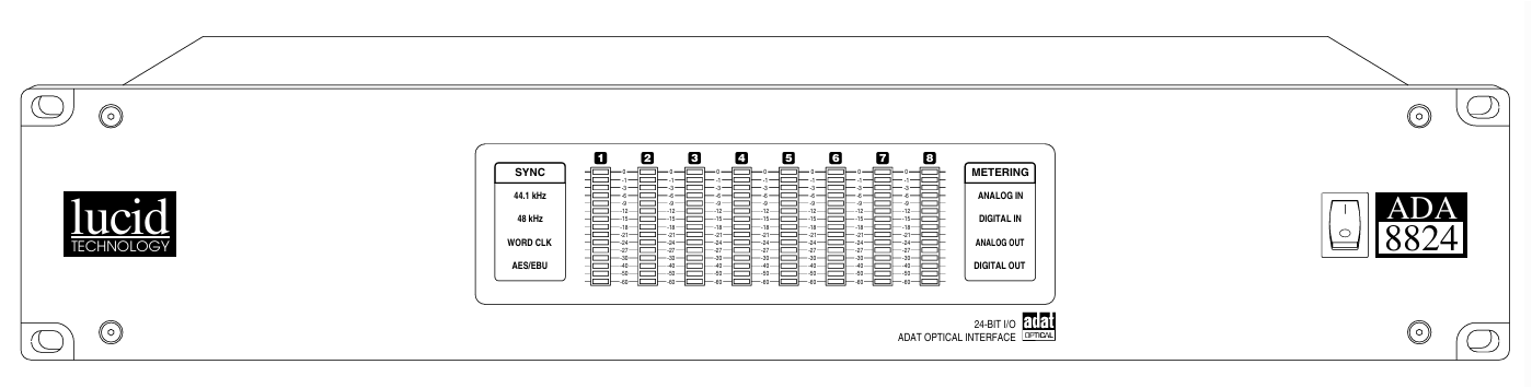 Lucid ADA8824는 8채널, 24비트 AD/DA 컨버터로, 스튜디오 및 디지털 오디오 워크스테이션 환경에서 ADAT-Optical, AES/EBU, S/PDIF 등 다양한 입출력 포맷을 지원하는 고성능 오디오 인터페이스입니다.